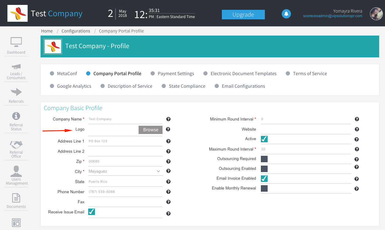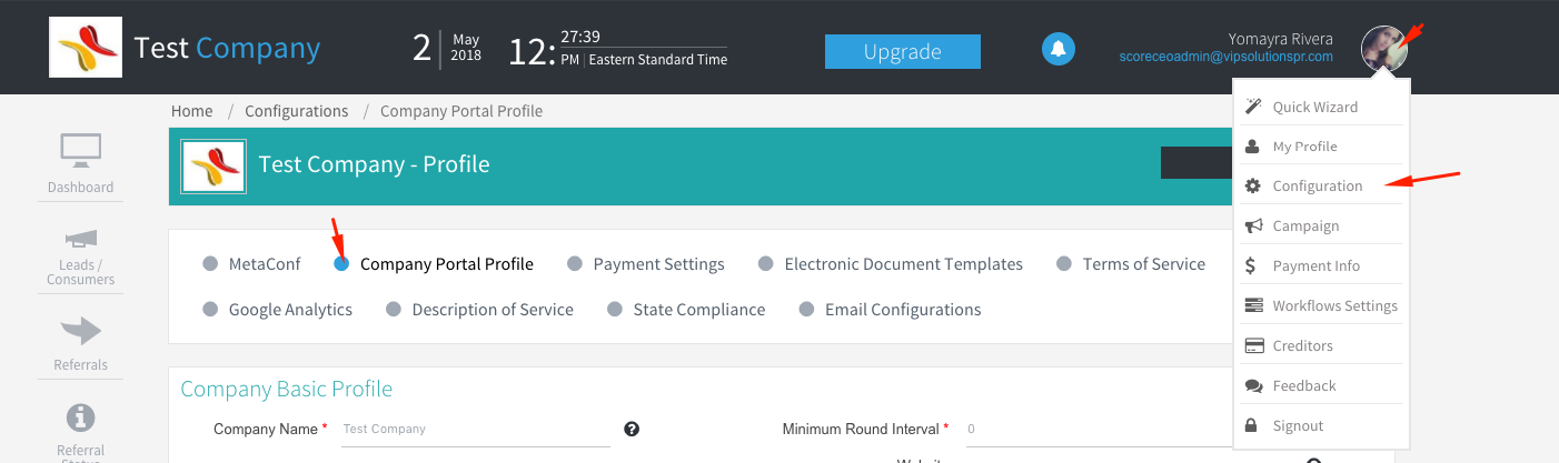 - Let’s start the process of adding logo by going to your Profile Bubble> Configurations> Company Portal Profile!